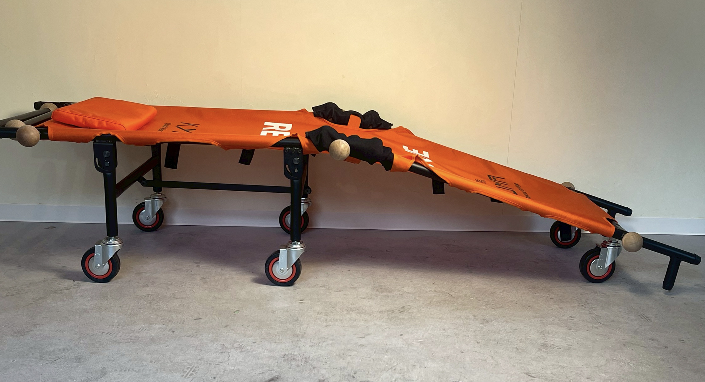 救馬は6輪式の構造を採用しており、搬送時に体重が均等に分散されるため、少 ない力での運搬が可能です。特に⾧距離での運搬で負担を軽減します。重い患 者でもスムーズに運べるため、救護者の体力消耗を抑え、快適で移動も楽に行 えます。